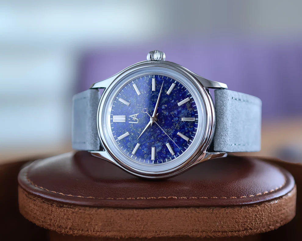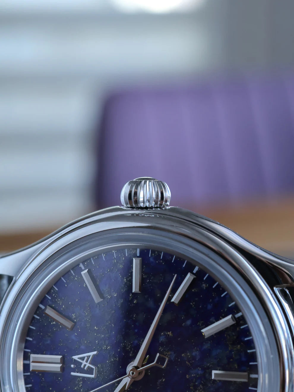 داخل علبتنا فائقة الرقة بقطر 38 مم، يُصبح الحجر جوهرة الساعة: بسيط للوهلة الأولى، ساحر عن قرب. لا يتشابه ميناءا الساعة أبدًا؛ فكل شريحة من اللازورد تحمل نمطها الخاص وشخصيتها الفريدة، مما يجعل كل ساعة تحفة فنية من إبداع الطبيعة.