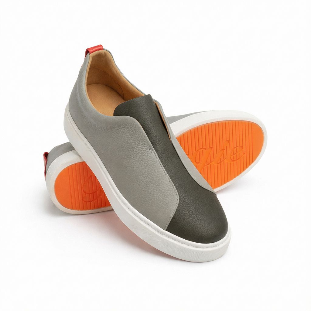 Step up your everyday look with these Bougies Light Beige On Khaki sneakers. The sleek slip-on design keeps things effortless, while the textured Beige upper adds a refined, premium touch. A bright orange sole gives a bold pop of color, making the pair stand out without trying too hard.